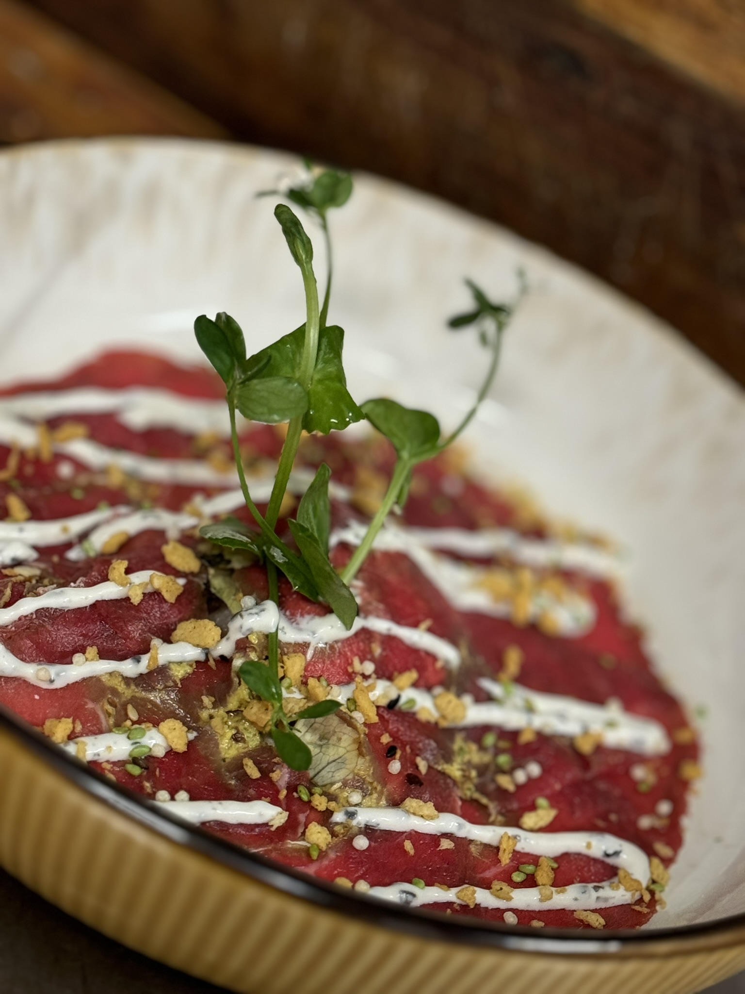 Pak een eetlepel met saus, giet een derde van de saus op het vlees en maak vervolgens met de rest ronddraaiende bewegingen rondom het vlees om een mooi effect te creëren. Strooi nog wat groen bovenop voor de finishing touch.